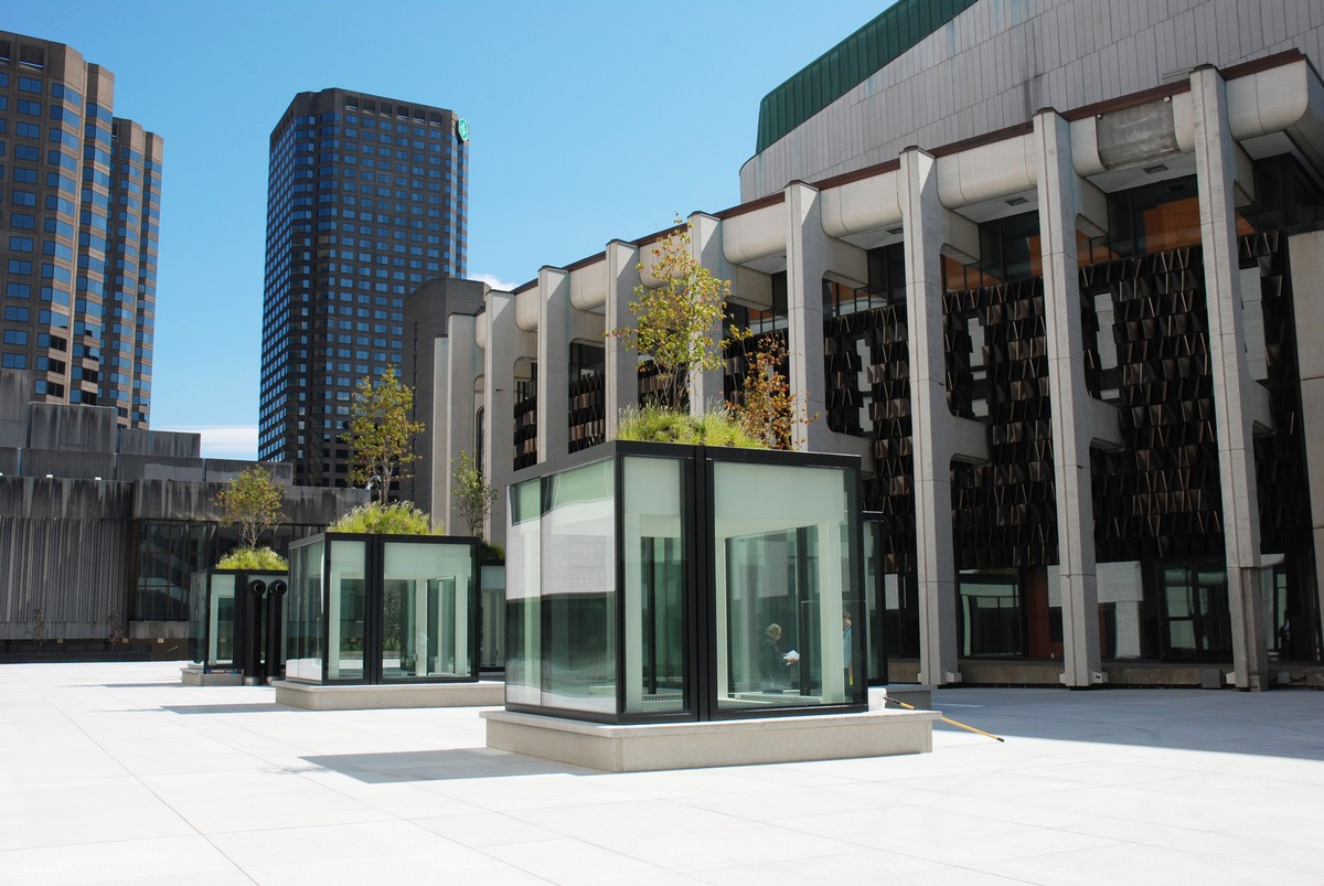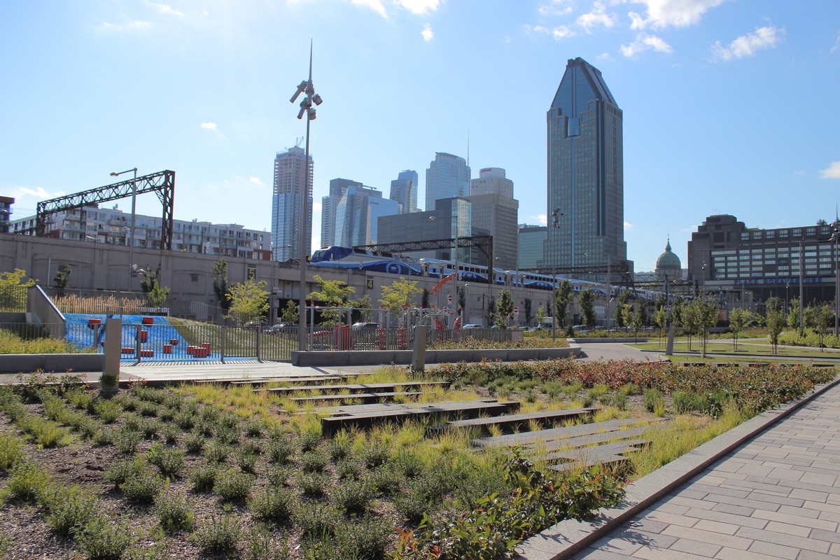 Toits végétalisés sur des puits de lumière aménagés sur l’esplanade de la Place des arts à Montréal. Photo : Michel Bouliane.