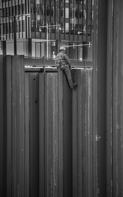 Le point faible de l’homme, Chigago, Illinois – Dès que j’ai pris cette photo, mes pensées sont allées directement vers les testicules de cet homme. Tous ceux qui en possèdent savent à quel point ces petites choses sont sensibles, fragiles et susceptibles. Faut vraiment être courageux pour s’y tenir en équilibre à 20 mètres de hauteur sur de la tôle. Encore à ce jour, je me demande comment il a bien pu faire pour quitter cet endroit.