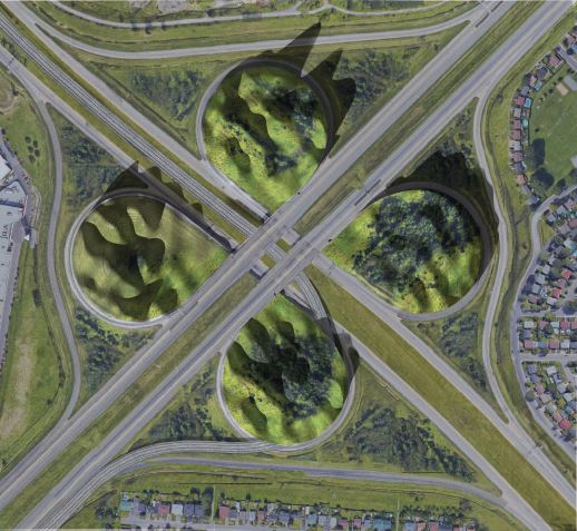 Sur la Rive-Sud de Montréal, inséré dans un terrain vague de l’échangeur autoroutier 10-30, le site devient un lieu de socialisation et de production alimentaire : un « Nœud productif habitable ». Ici, la technologie, combinée à de nouvelles approches en matière de conception et de planification, transforme la vie suburbaine. Pour éliminer la dépendance à une agriculture industrialisée et polluante, on a installé des infrastructures de production alimentaire locales, là où l’on trouvait des échangeurs autoroutiers. Ces infrastructures sont à la lisière de la banlieue et des terres agricoles. Ces nouveaux centres, comme ici, à l’intersection des autoroutes 10 et 30, sont devenus des nœuds importants de transport et de commerce. Mieux ? Ils favorisent la sociabilité.