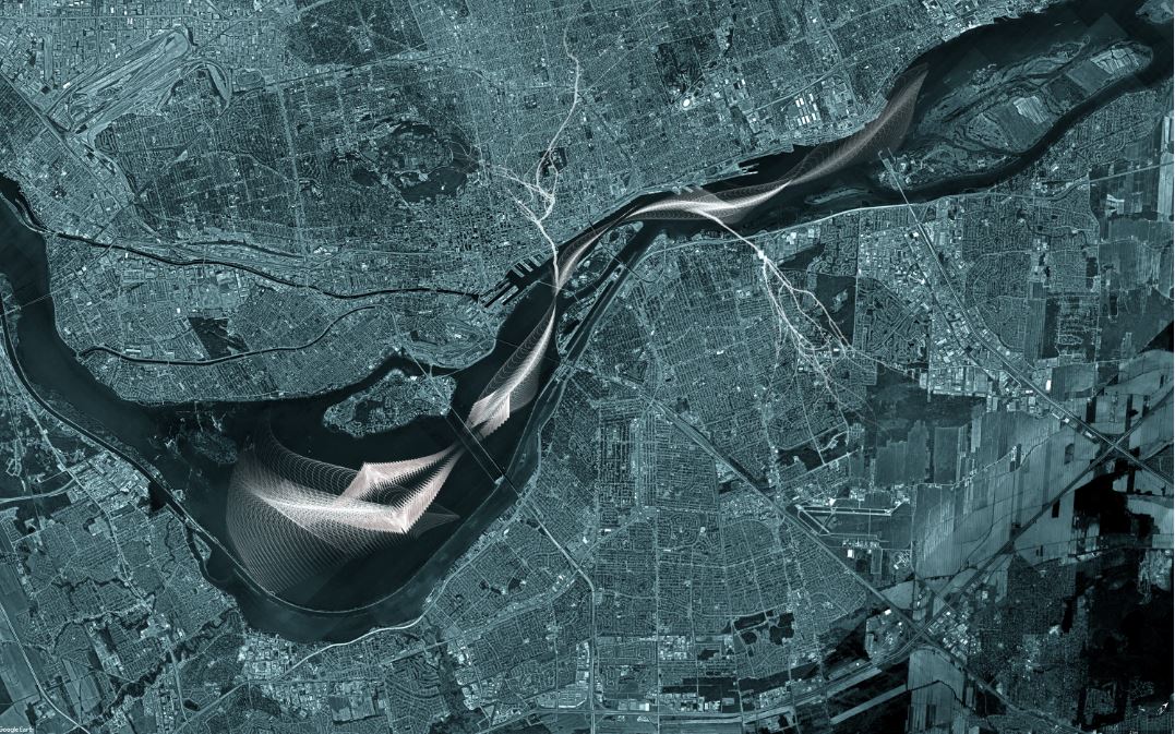 Projet localisé le long de la voie maritime entre le pont Victoria et l’écluse de Sainte-Catherine qui propose un ruban de 13 km d’aménagements axés sur la santé, le plein air et la contemplation. En 2067, la population de la région est devenue si importante, et les besoins pour de nouveaux espaces si criants que le site s’est réinventé. Les Montréalais peuvent désormais se détendre sur les rives du fleuve, où le plan d’eau est à son plus large. Ils accèdent au site rapidement et sans voiture et la digue est aménagée à la manière des promenades en bord de mer. L’équipe s’est inspirée de la construction du Montréal souterrain vers 1960. À l’époque, les promoteurs immobiliers qui obtenaient des lots près des stations de métro s’engageaient à aménager des aires publiques. Même principe pour la digue.