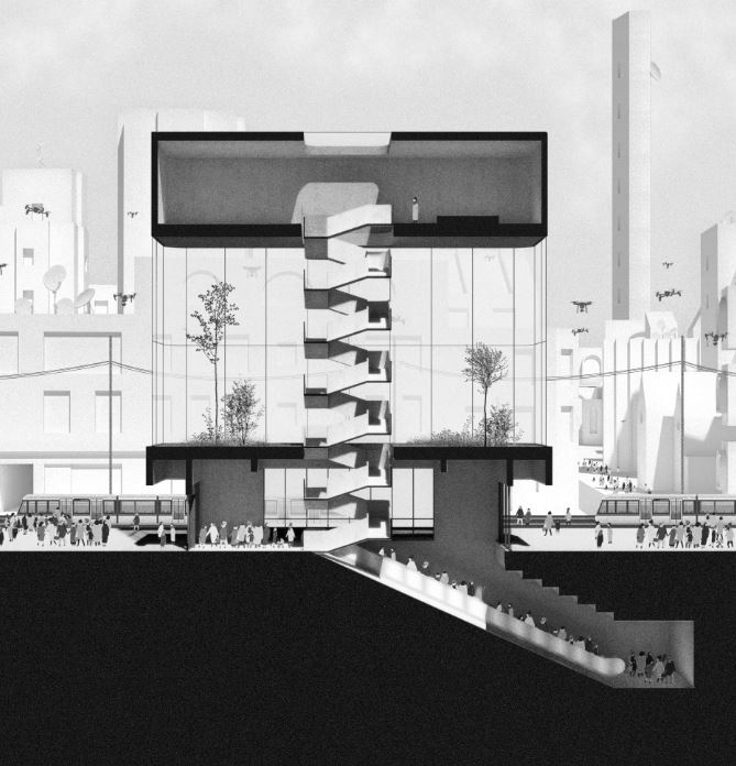 Big City repense un lieu de passage très fréquenté à Montréal. La firme imagine un espace de mobilité où il fait bon vivre. L’infrastructure routière peu conviviale qu’est la rue Berri entre les rues Ontario et Cherrier n’est plus la même en 2067. L’artère avait d’abord été pensée pour le passage des voitures entre le centre-ville et le quartier du Plateau Mont‑Royal, mais, dans le Montréal de demain, une nouvelle place, sur la rue Cherrier, surplombe cette zone et agrémente le parcours menant du carré Saint-Louis au parc Lafontaine – deux lieux très fréquentés par les Montréalais.