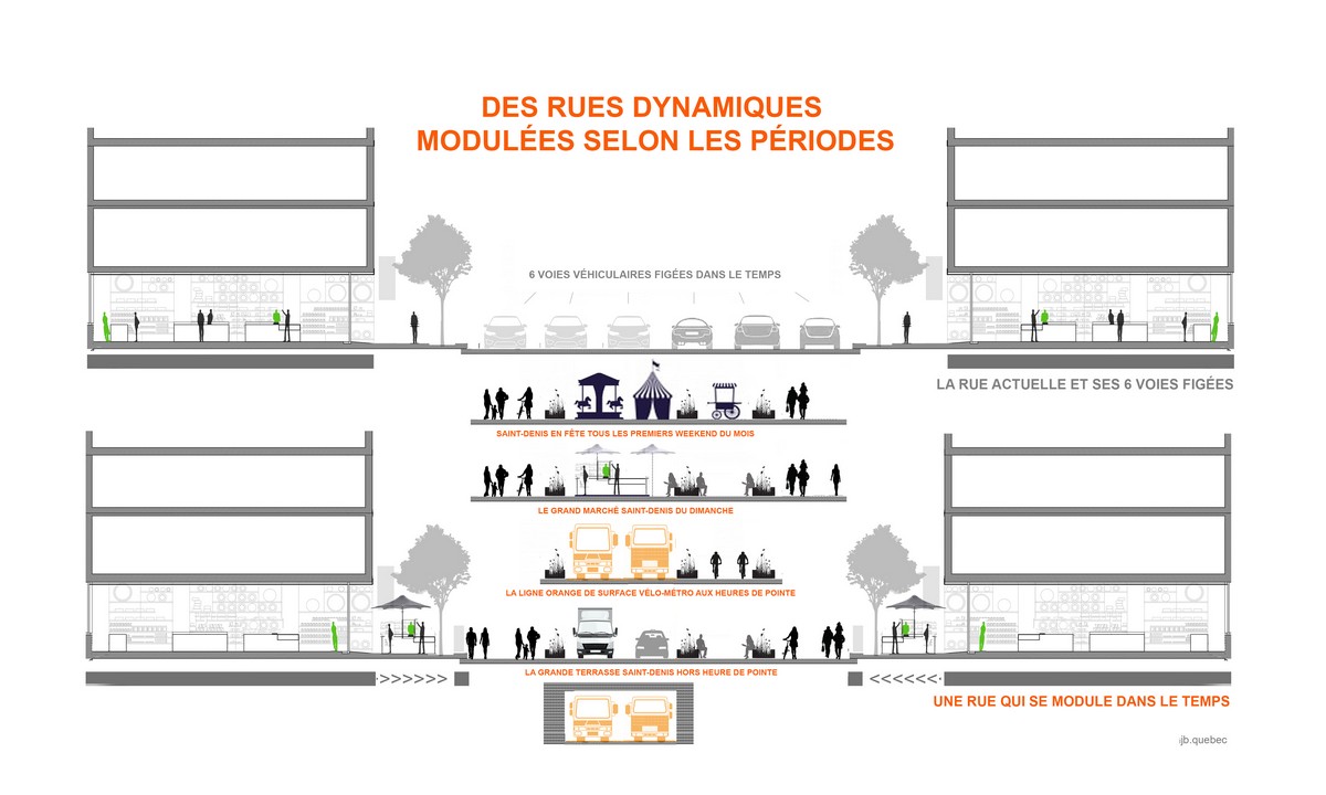 Six voies (six !) dédiées transit, été comme hiver, heure de pointe ou pas, semaine comme weekend. Une surproportion de voies véhiculaires par rapport à l’espace du piéton qui ne lui est pas unique à l’échelle du Québec. Au lieu des six voies figées de Saint-Denis, si on abordait son aménagement dans une perspective plus dynamique, on pourrait doter notre quartier d’espaces exceptionnels.
