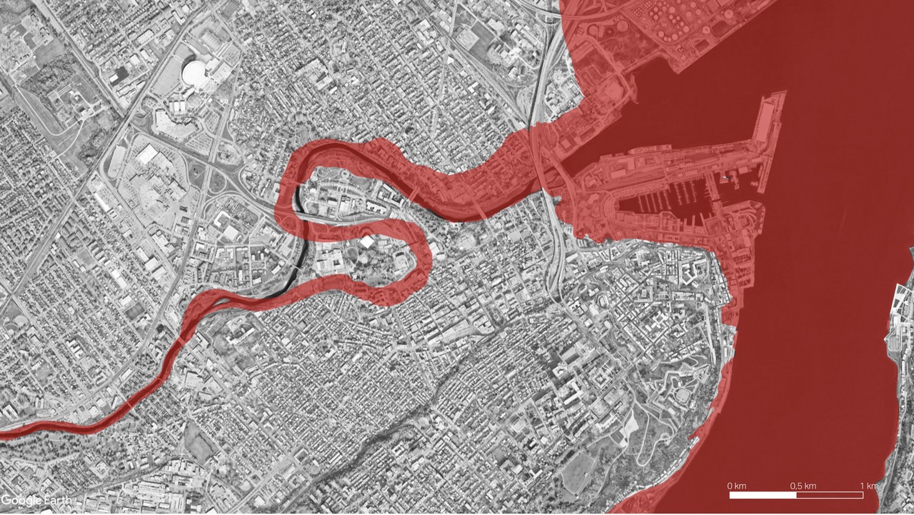 La rivière Saint-Charles faisait autrefois deux méandres avant de se jeter dans le fleuve Saint-Laurent. Cette reconstitution montre comment la Basse-Ville de Québec et le Vieux-Port se sont construits en empiétant sur la rivière Saint-Charles et son embouchure. Source : @ Creare_Gianpiero Moretti