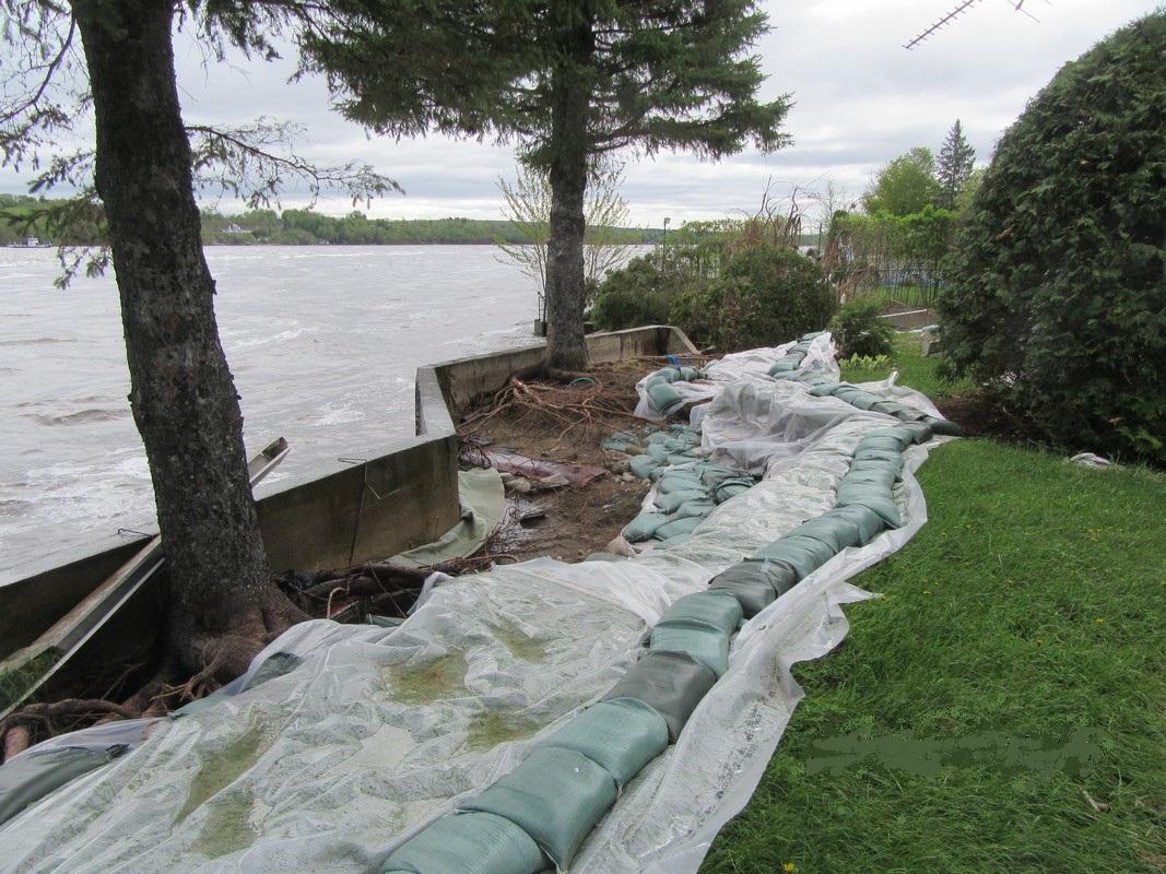 À Pointe-Fortune, des riverains construisent des murs pour empêcher l’eau d’avancer sur leur terrain. D’autres installent des blocs de béton pour empêcher l’eau de gruger la rive. Ces interventions offrent une protection ponctuelle, car l’eau frappe encore plus fort les terrains non protégés. Source : François Bélanger