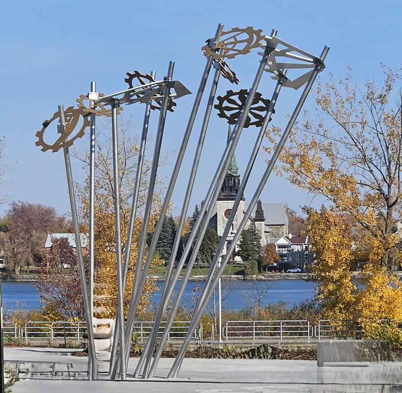 Au fil de l’eau. Cette œuvre réalisée en 2025 à Saint-Jean-sur-Richelieu représente une série d’engrenages imbriqués les uns aux autres rappelant le mécanisme d’un ancien pont-levis du canal de Chambly. – Photo : Joëlle Morosoli