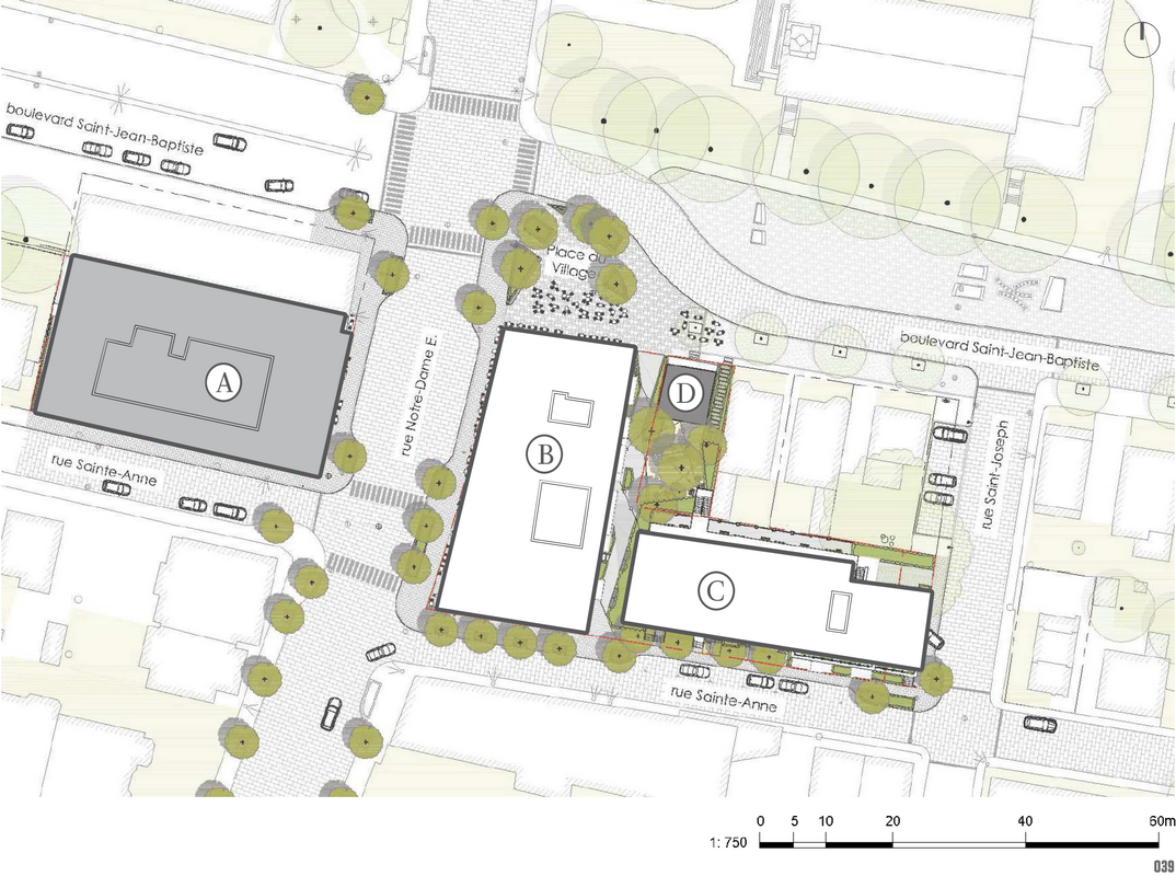 Situé de part et d’autre de la rue Notre-Dame, entre la rue Sainte-Anne et le boulevard Saint-Jean-Baptiste, le projet comprend trois bâtiments mixtes (A-B-C) comportant 109 logements locatifs, six commerces de proximité et une maison patrimoniale (D). – Source : ADHOC/Gracieuseté de la Société de développement Angus